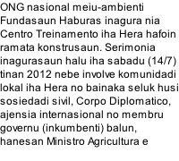 Turizmu Komunitario Dokumentasaun More information  about haburas Inagurasaun Centro Treinamento e Recursos Ambientais, Hera, Dili Demétrio Amaral: Centro ne’e…sei sai mos Monumentu Moris ba luta defende meiu-ambienti… Biobriket