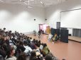 22 de março. Recebemos, juntamente com 4 turmas da Escola Secundária da Amora e a equipa de Cidadania e Desenvolvimento, o rapper, músico e artista multifacetado Xullaji no auditório da escola, com o qual tivemos uma conversa muito participada e enriquecedora! Xullaji, nome artístico principal de Nuno Santos, de pais cabo-verdianos mas nascido e crescido na Margem Sul, é um nome fundamental do hip hop português que tem, desde o início do seu percurso artístico, utilizado o rap e a música como lugares de luta anti-racista e anti-colonial. A partir do visionamento de um dos seus vídeos, A luta continua, falámos de vários temas: desde porque é que ele quis fazer música, ainda miúdo; da importância da cultura hip-hop para o seu crescimento político, pessoal e musical; da situação atual do racismo em Portugal; das mudanças que se deram na luta antirrascista depois do 25 de abril; mas também da globalização e das migrações no mundo por causa das políticas predatórias do neocolonialismo, das relações entre a economia hegemónica e a nossa cultura... e muito mais! Até à importância da arte, quando entendida como empenho social, que nos ajuda a perceber o mundo e não apenas a entreter-nos, adormecendo-nos ainda mais! Xullaji ajudou-nos a perceber o quanto campos como a música e as lutas políticas estão entrelaçados. Falámos de música e de envolvimento político antirrascista e anti-colonial, da música de intervenção portuguesa, mas também de teatro e das várias formas artísticas que o Xullaji põe em ação e, sobretudo, dos valores que, qualquer que seja a forma escolhida, orientam o trabalho de tantas e tantos artistas que escolhem a arte para lutar por um mundo mais justo. Os e as jovens estudantes participaram animadamente, com muitas perguntas e comentários que geraram um debate rico em opiniões diferentes, num clima de diálogo e de escuta recíproca, sem medo de dizer o que pensam, e com vontade de aprender em conjunto. Tantas foram as perguntas e intervenções que quase não deixávamos o Xullaji ir-se embora... Encerrámos o encontro com uma prenda feita por um estudante, que a escola ofereceu ao artista, convidando-o a voltar quando quiser: uma escultura com um abraço, simbolizando o abraço que a escola lhe deu! Obrigada ao Xullaji por ter partilhado este momento connosco e aos e às jovens que participaram com tanto entusiasmo!
