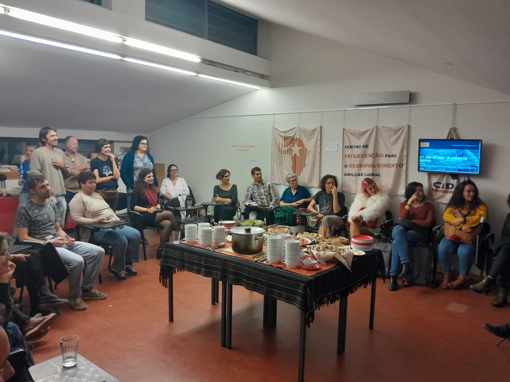 2 de julho. Desta vez o projeto Sem Sombras veio a Lisboa! As e os jovens de Ponte de Sôr e da Chamusca tiveram finalmente a oportunidade de conhecer as instalações do CIDAC, com uma visita ao Centro de Documentação e à Loja do Comércio Justo, para depois seguir para o Terraço do Graal, onde receberam também mais informações sobre a associação e a sua história. No Graal, estavam à nossa espera algumas cooperantes da cooperativa de mulheres migrantes Bandim, que apresentaram o seu projeto e as refeições que cozinharam para o nosso almoço. As e os jovens apreciaram a comida e os sabores de diferentes regiões do mundo e ficaram a conhecer o projeto intercultural da Bandim. A seguir ao almoço, tivemos o importante testemunho de Francisco Praia Azul, que pertence à comunidade romani e que nos falou sobre a cultura e a história do seu povo. Foi um momento muito enriquecedor em que, inclusive, aprendemos muitas das principais razões pelas quais a cultura romani e este povo são, desde séculos, alvo de discriminação e marginalização. A conversa e o debate que se seguiram foram animados e permitiram-nos refletir sobre os valores de liberdade, igualdade e antirracismo. Animadas/os pelos mesmos, o dia continuou com uma breve visita a lugares emblemáticos da cidade. Percorremos a Avenida da Liberdade, relembrando a celebração anual do 25 de Abril, chegámos ao Largo de São Domingos, que destacámos como importante lugar de encontro entre culturas diferentes, mas também pelos acontecimentos trágicos de intolerância religiosa e antissemitismo que aconteceram no XVI século. Subimos ao Largo do Carmo, coração da Revolução dos Cravos, e acabámos a visita na Rua Garrett, um dos símbolos da luta antirracista, por ter sido, a 10 de junho 1995, o lugar onde o jovem cabo-verdiano Alcindo Monteiro foi violentamente espancado por um grupo de skinheads da extrema-direita nacionalista. Na sequência deste ataque, Alcindo morreu dois dias depois. Concluímos, assim, este dia relembrando a importância das lutas antirracista e antifascista. Apesar da brevidade da visita, esperamos que o grupo tenha voltado para casa mais enriquecido e com algumas perguntas que possam estimular o espírito critico. Venham mais visitas!
